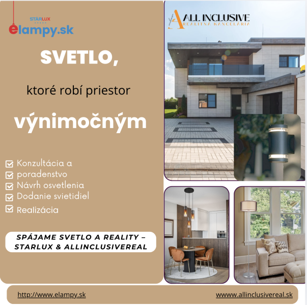 Realitná kancelária ALL INCLUSIVE REAL poskytuje profesionálny servis pri predaji a prenájme nehnuteľností – my v eLampy k tomu pridávame svetlo, ktoré „predáva“.