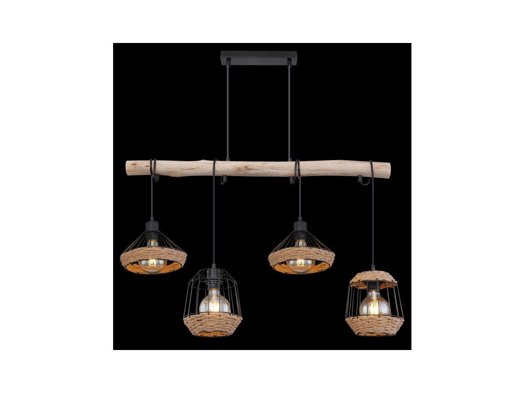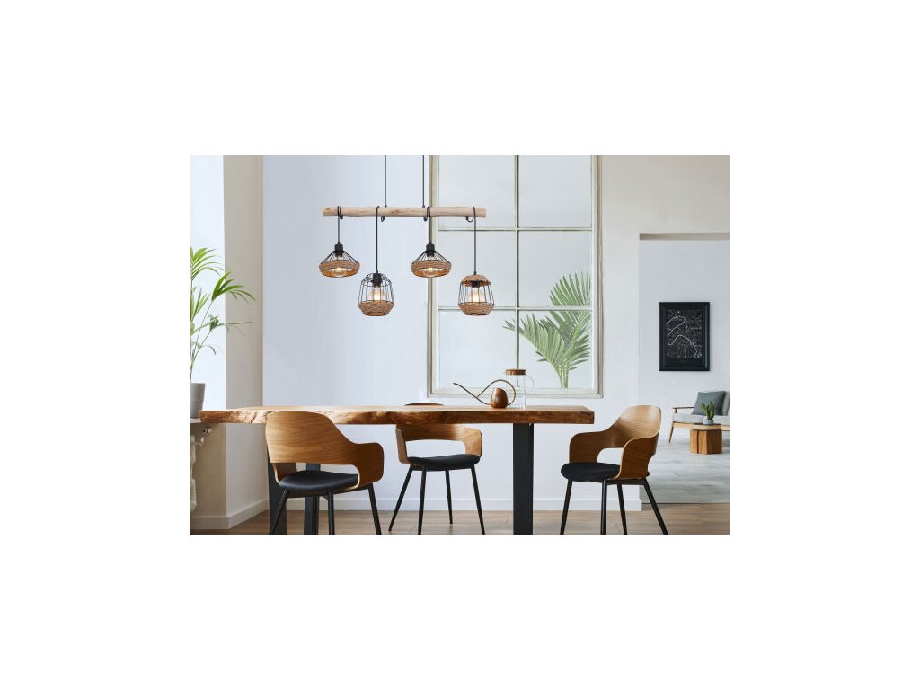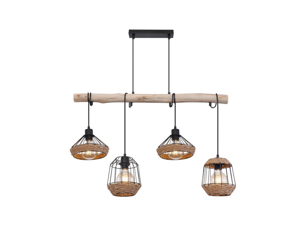 Táto 105 cm dlhá závesná lampa Surri sa dokonale hodí na umiestnenie nad jedálenský stôl, na ktorom potom dochádza k rovnomernému osvetleniu. Vďaka káblu omotanému okolo drevenej tyče je možné výšku závesného svietidla pri montáži nastaviť až na 120 cm. Navyše má štyri rôzne tvarované, čierno-matné kovové tienidlá, ktoré sú na niektorých miestach omotané konopným lanom. Žiarovka nie je v balení, to vám dáva možnosť, vybrať si farbu a jas svetla podľa vlastných preferencii.