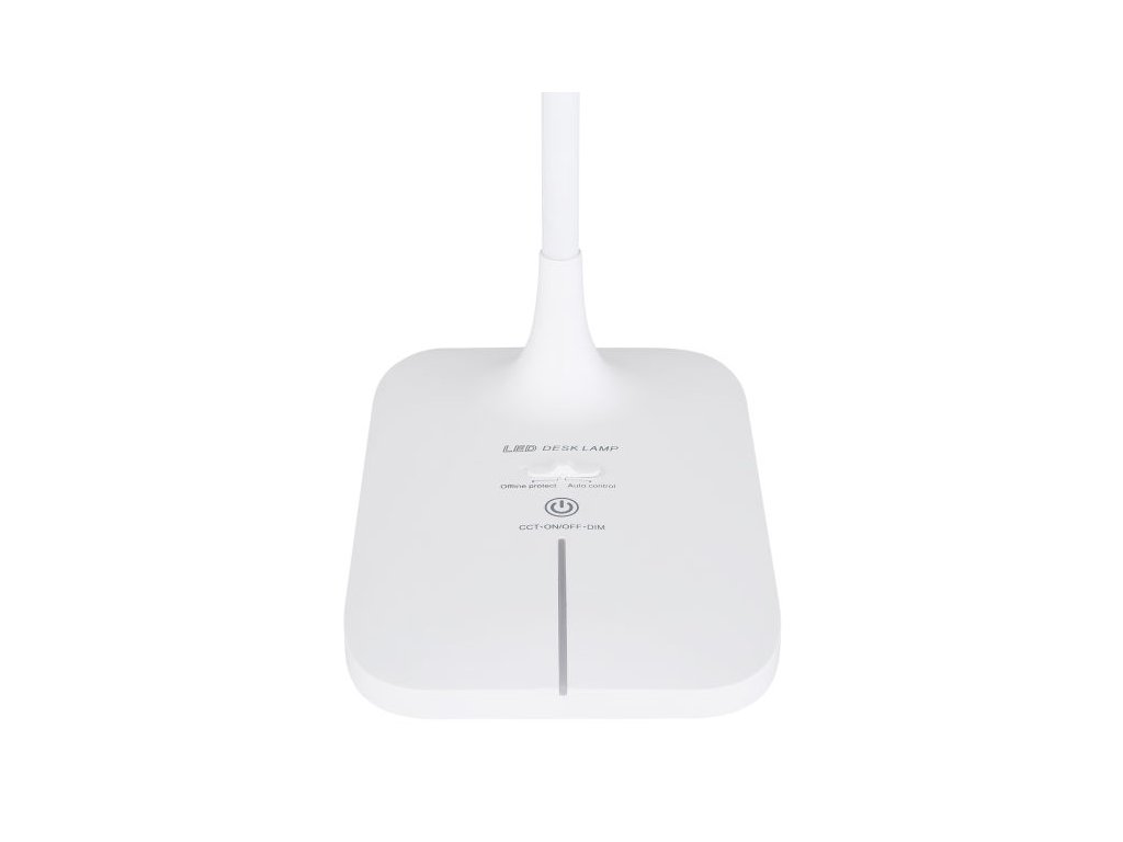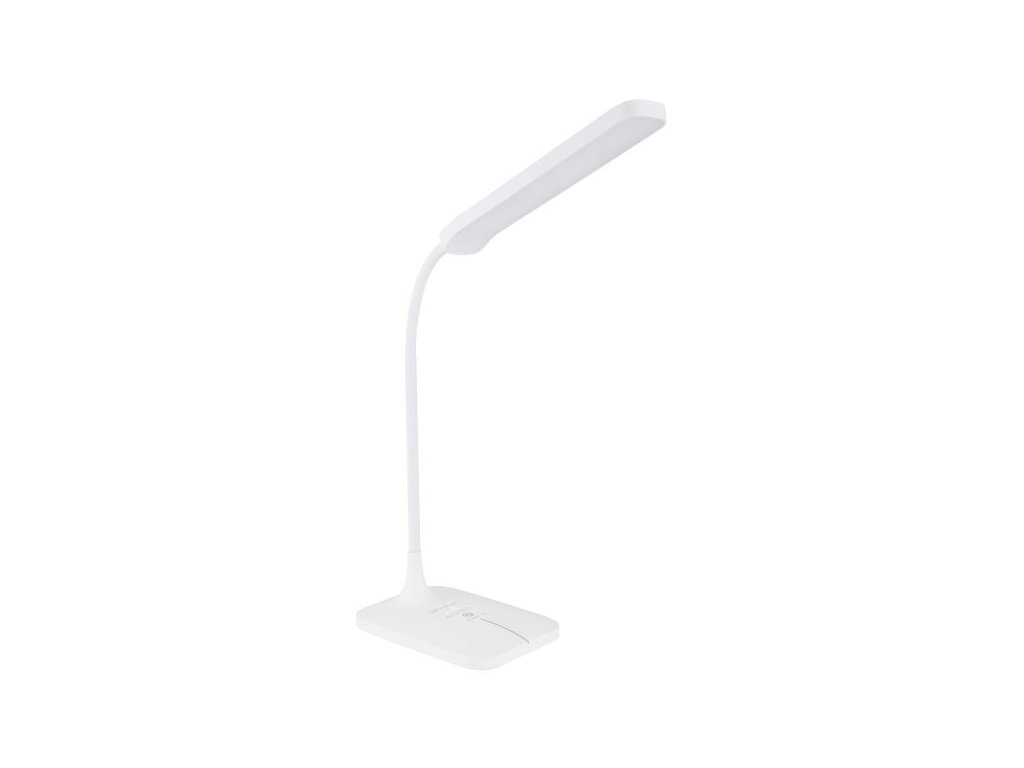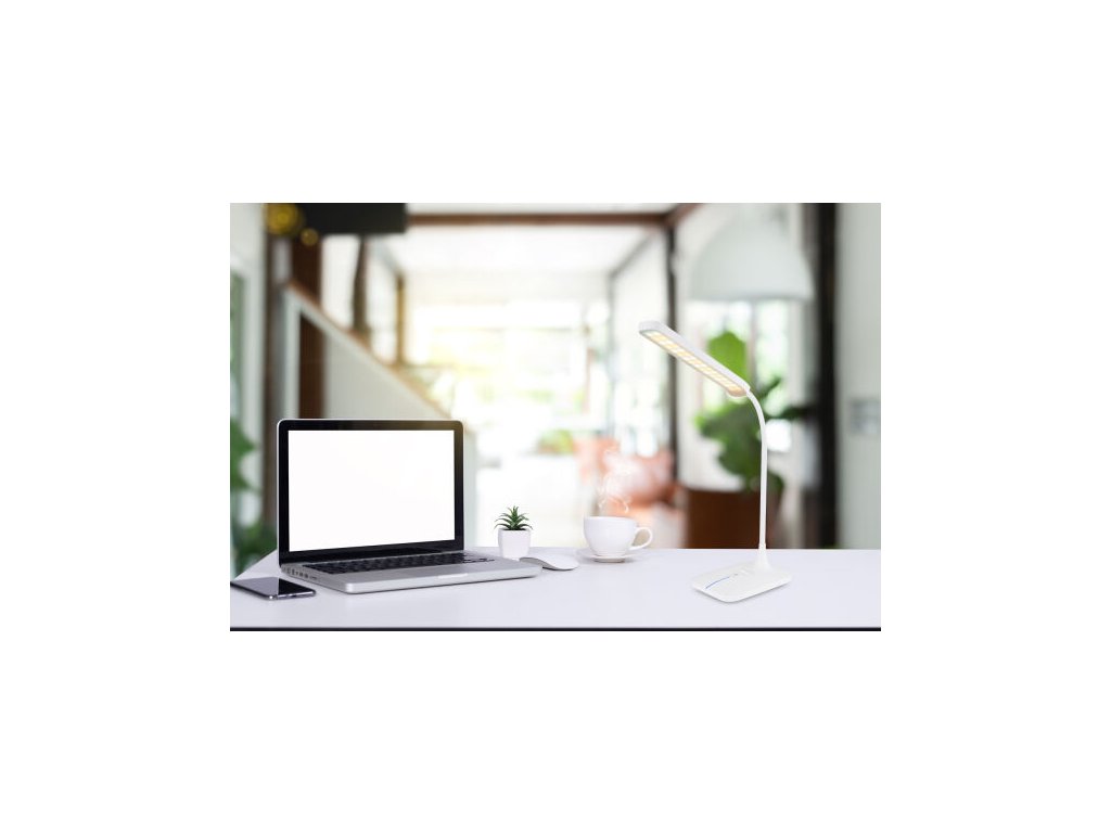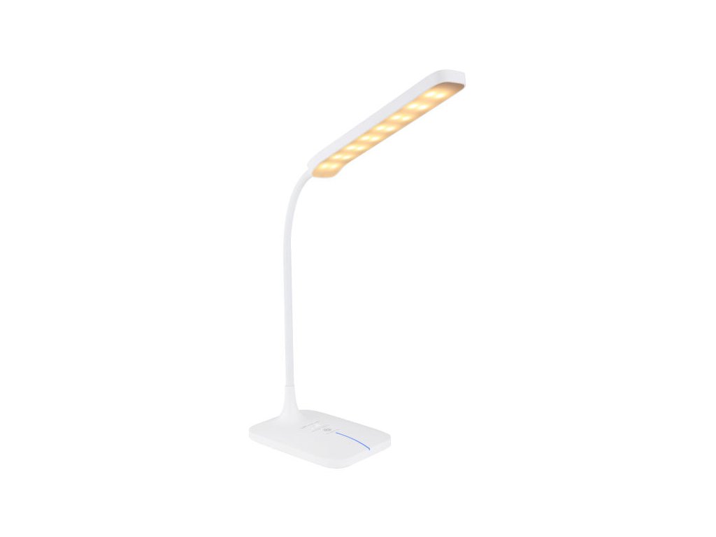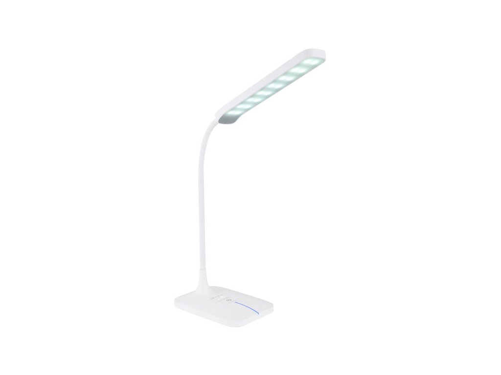 Biela plastová stolná lampa s opálovým krytom má obdĺžnikový podstavec a je možné ju flexibilne nastavovať. Batéria sa nabíja pomocou dodávaného USB kábla. Jas je možné regulovať pomocou dotykového stmievača a farbu svetla je možné nastaviť od 3 000 Kelvinov (teplá biela) do 6 000 Kelvinov (studená biela).