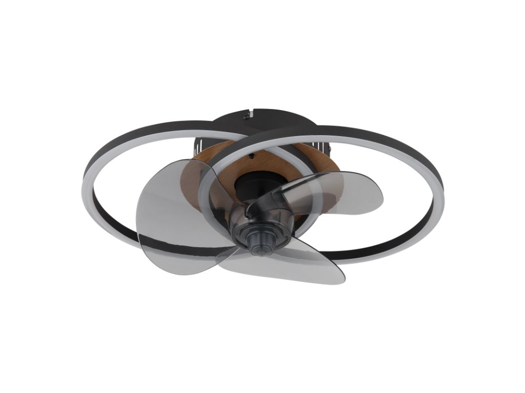 Stropný ventilátor, kov čierny/imitácia dreva,plast biely/dymový, stmievateľný, niekoľko úrovní pomocou nástenného vypínača, pamäť, diaľkové ovládanie,20m², DxŠxV:420x280x144mm,ølopatky 28cm,LED 24W 230V,zdroj 150-2800lm,výstup 28-490lm,CCT2700-6500K