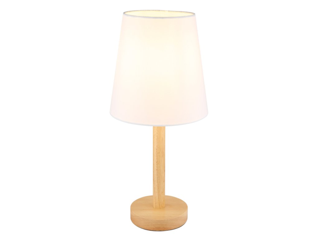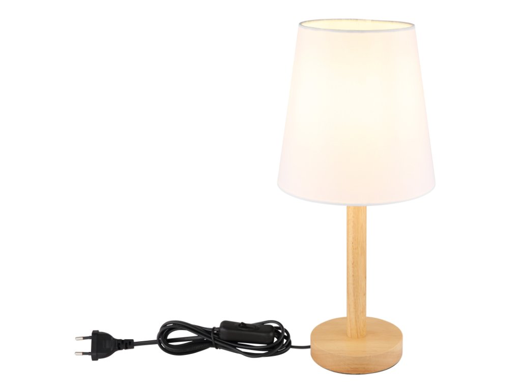 Stolové svietidlo, kov vzhľad dreva, textil biely, kábel PVC čierny, kolískový vypínač na kábli, ø 200mm, V: 450mm, dĺžka kábla 1500mm, bez žiarovky 1xE14, max. 25W 230V