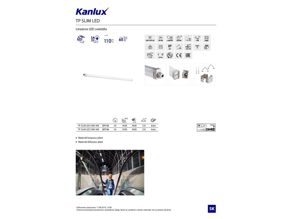 Kanlux TP SLIM LED je malé vzduchotesné svietidlo, ktoré je možné namontovať na povrch alebo zavesiť. Ľahká montáž vďaka nastaviteľným držadlám a rýchlym spojkám. Vďaka triede tesnosti IP65 a odolnosti voči nárazu IK 08 môžeme svietidlo používať na takých miestach, ako sú priemyselné miestnosti, sklady, parkoviská a garáže.