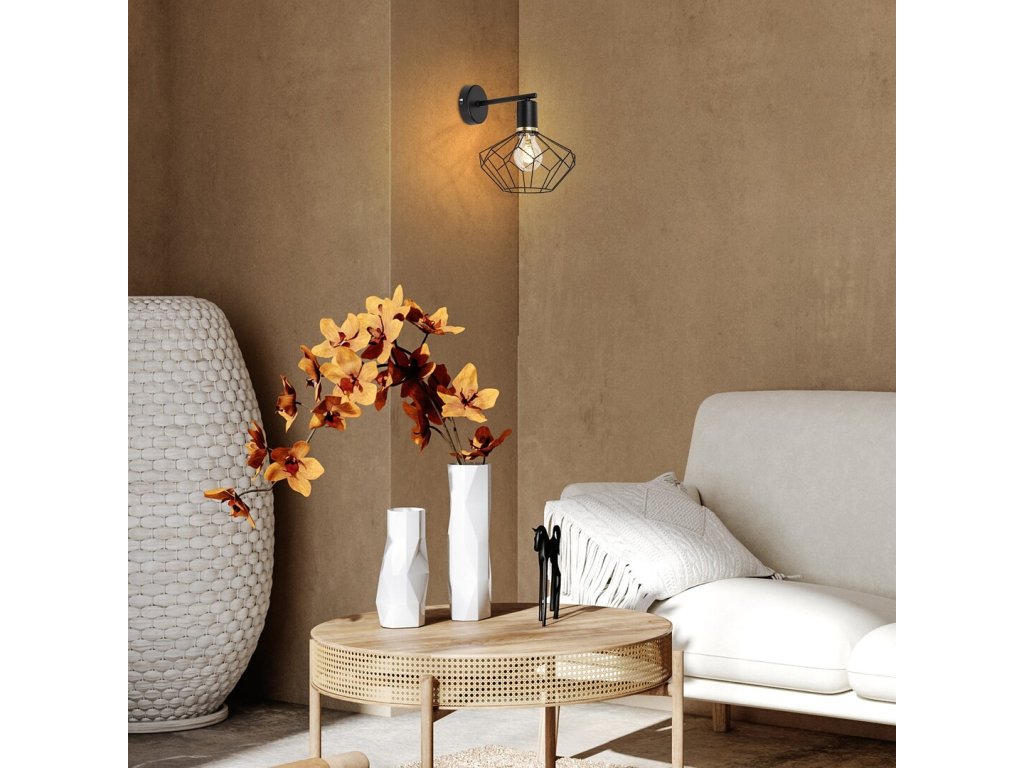 Vintage nástenné svietidlo Fran sa odporúča predovšetkým do obývacej izby alebo spálne. Matné čierne svietidlo, ktoré je celé vyrobené z kovu, je doplnené tienidlom s tyčou pripomínajúcou tvar diamantu. Svietidlo je možné upevniť na stenu pomocou malej okrúhlej dekoratívnej základne. Hlava závesnej lampy je pripevnená k valcovému prvku vyčnievajúcemu z ozdobnej základne. Keďže tienidlo umožňuje plne vidieť zdroj svetla, je dobré zvoliť pre tento model estetickú žiarovku s netradičným tvarom.