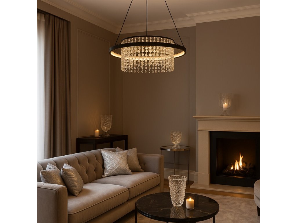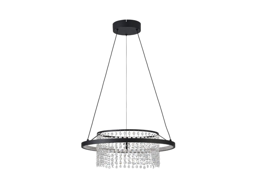 Svietidlo má čierne kovové telo v okrúhlom tvare, doplnené o priehľadné krištáľové tienidlo, ktoré dodáva priestoru luxusný nádych. Zaujímavým detailom je zhluk krištáľových nití visiaci zo stredu svietidla, ktorý vytvára jedinečný svetelný efekt.