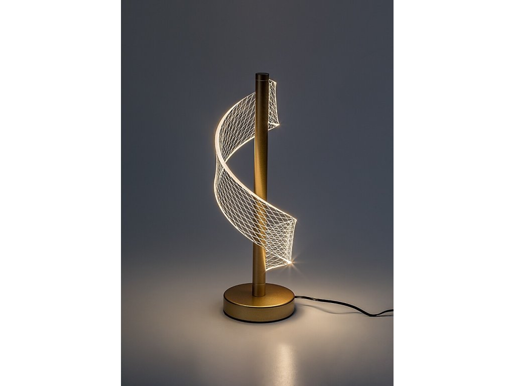 Táto jedinečná stolová lampa kombinuje zlaté kovové telo s priehľadným akrylovým tienidlom s jemným zdobením. Štíhle predĺžené telo je elegantne obkolesené stuhovitým tienidlom s vlnitými líniami, čo jej dodáva sofistikovaný vzhľad. Stabilitu zabezpečuje okrúhla zlatá dekoratívna základňa.
