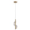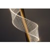 Tento dizajnový luster kombinuje zlatý kovový úchyt a priehľadné akrylové tienidlo s jemným vzorom. Štíhly vertikálny prvok je obklopený tienidlom v tvare stuhy so zvlnenými líniami, čo svietidlu dodáva jedinečný charakter.