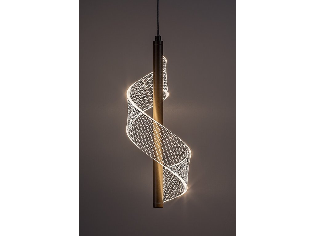 Tento dizajnový luster kombinuje zlatý kovový úchyt a priehľadné akrylové tienidlo s jemným vzorom. Štíhly vertikálny prvok je obklopený tienidlom v tvare stuhy so zvlnenými líniami, čo svietidlu dodáva jedinečný charakter.