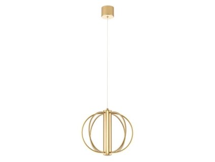 Závesné interiérové svietidlo vybavené LED diódami SMD, TRIAC stmievateľné, konštrukcia z hliníka a kovu lakovaná v matnej zlatej farbe, difúzor z opálového bieleho silikónu.
