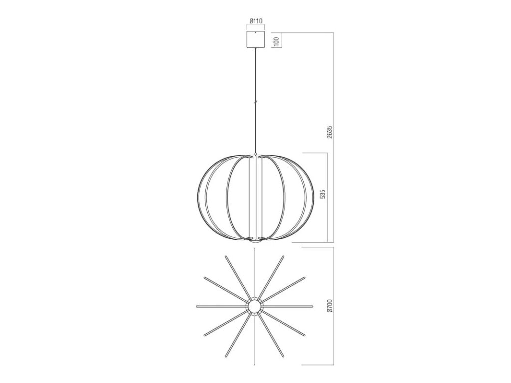 Závesné interiérové svietidlo vybavené LED diódami SMD, TRIAC stmievateľné, konštrukcia z hliníka a kovu lakovaná v matnej zlatej farbe, difúzor z opálového bieleho silikónu.