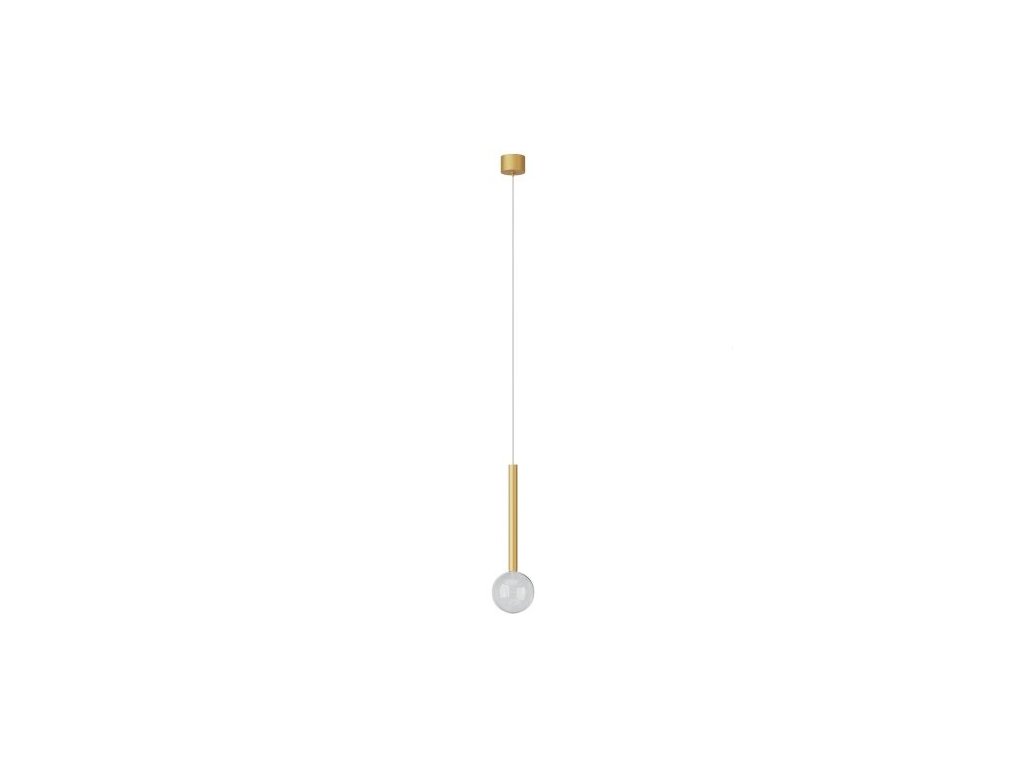 Závesné interiérové svietidlo s COB LED diódami, stmievateľné TRIAC, kovová a hliníková konštrukcia natretá v matnej zlatej farbe, difúzory z priehľadného fúkaného skla.