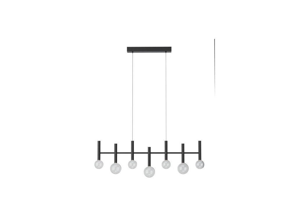 Závesné interiérové svietidlo s COB LED diódami, stmievateľné TRIAC, kovová a hliníková konštrukcia natretá v matnej čiernej farbe, difúzory z priehľadného fúkaného skla.