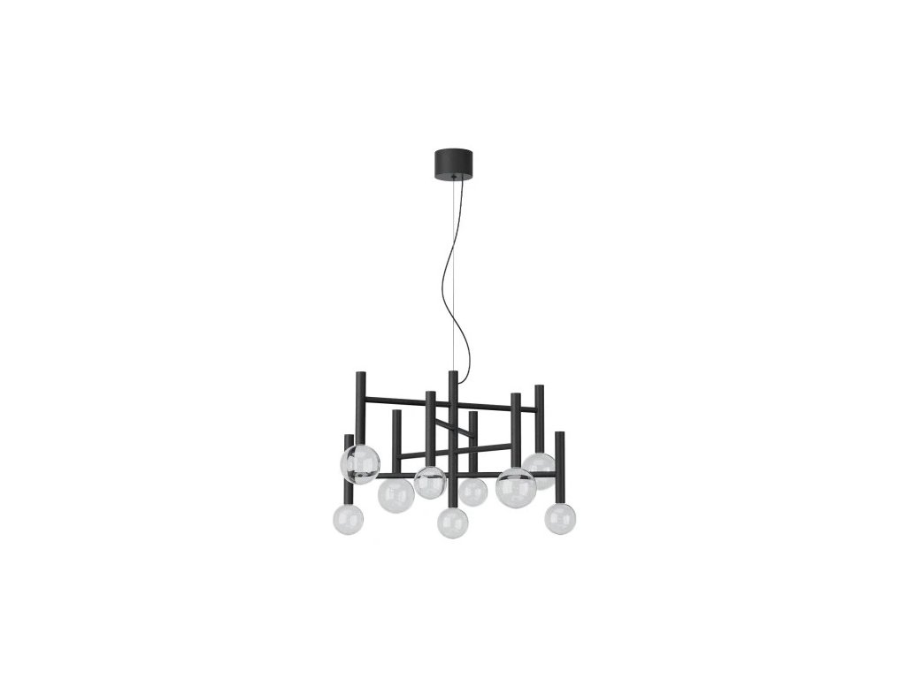 Závesné interiérové svietidlo s COB LED diódami, stmievateľné TRIAC, kovová a hliníková konštrukcia natretá v matnej čiernej farbe, difúzory z priehľadného fúkaného skla.