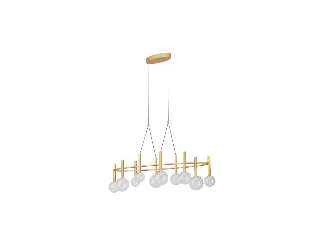 Závesné interiérové svietidlo s COB LED diódami, stmievateľné TRIAC, kovová a hliníková konštrukcia natretá v matnej zlatej farbe, difúzory z priehľadného fúkaného skla.