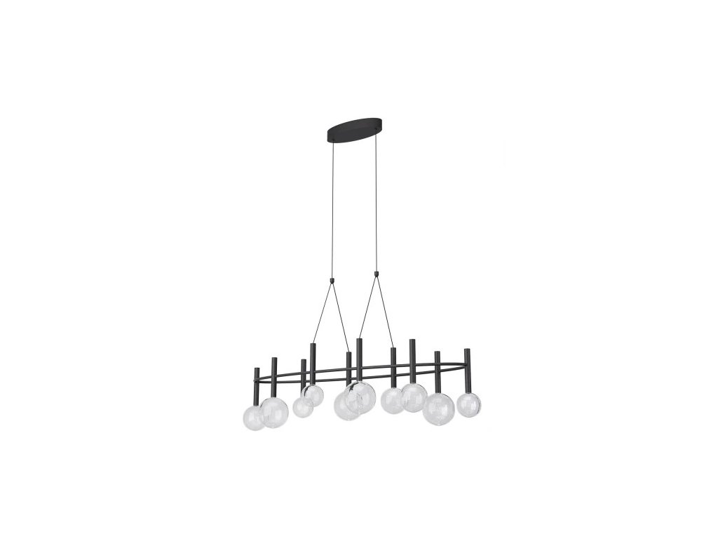 Závesné interiérové svietidlo s COB LED diódami, stmievateľné TRIAC, kovová a hliníková konštrukcia natretá v matnej čiernej farbe, difúzory z priehľadného fúkaného skla.