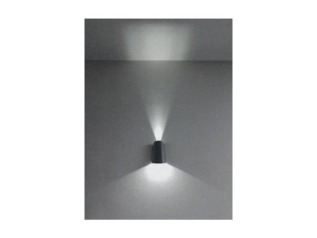 Nástenné exteriérové svietidlo vybavené LED diódami, s priamym/nepriamym osvetlením s efektom osvetlenia na stenu. Hliníková konštrukcia lakovaná v tmavohnedej farbe, priehľadný sklenený difúzor. Ochrana IP65 chráni svietidlo pred vonkajšími poveternostnými vplyvmi. Zabudovaný LED zdroj dodáva neutrálne biele svetlo.