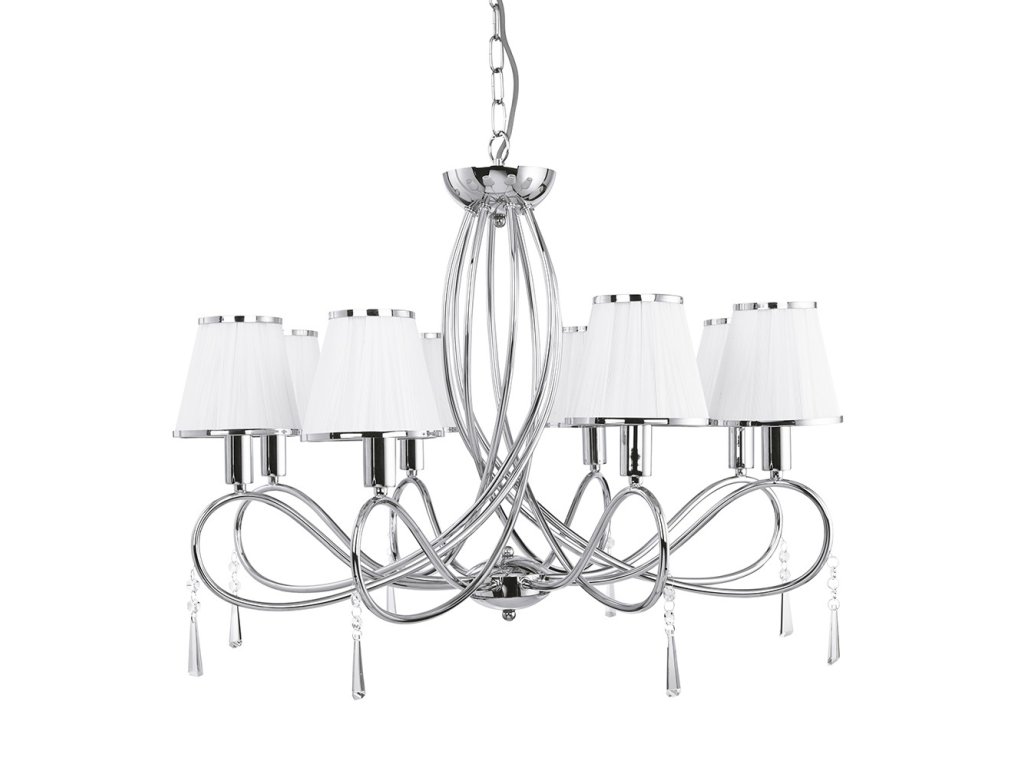 Toto svietidlo Simplicity so sklenenými kvapkami a bielymi tienidlami je vhodné do klasického i moderného interiéru. Z dekoratívneho centrálneho stĺpika vychádzajú prepracované zakrivené obruče s chrómovým povrchom, ktoré podporujú osem jednoduchých bielych tienidiel. Kovanie tiež obsahuje jemné sklenené kvapky, ako aj nastaviteľné reťazové zavesenie na strop.