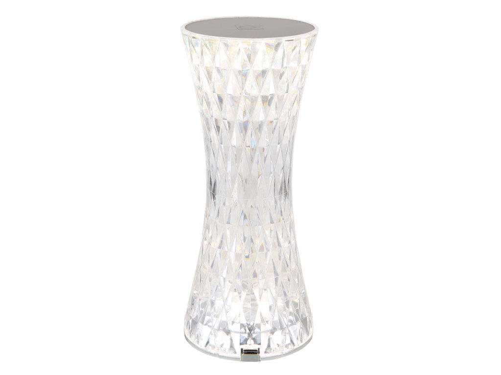 Nabíjateľná stolová lampa, číry plast s krištáľovým efektom, kov strieborný, dotykové zapínanie/vypínanie, RGB menič a fixácia farieb, bez adaptéra, vrátane aku. 800mAh 3,7V, ø:80mm, V: 185mm, dĺžka kábla 800mm, vrátane RGBW LED 1,5W 5V